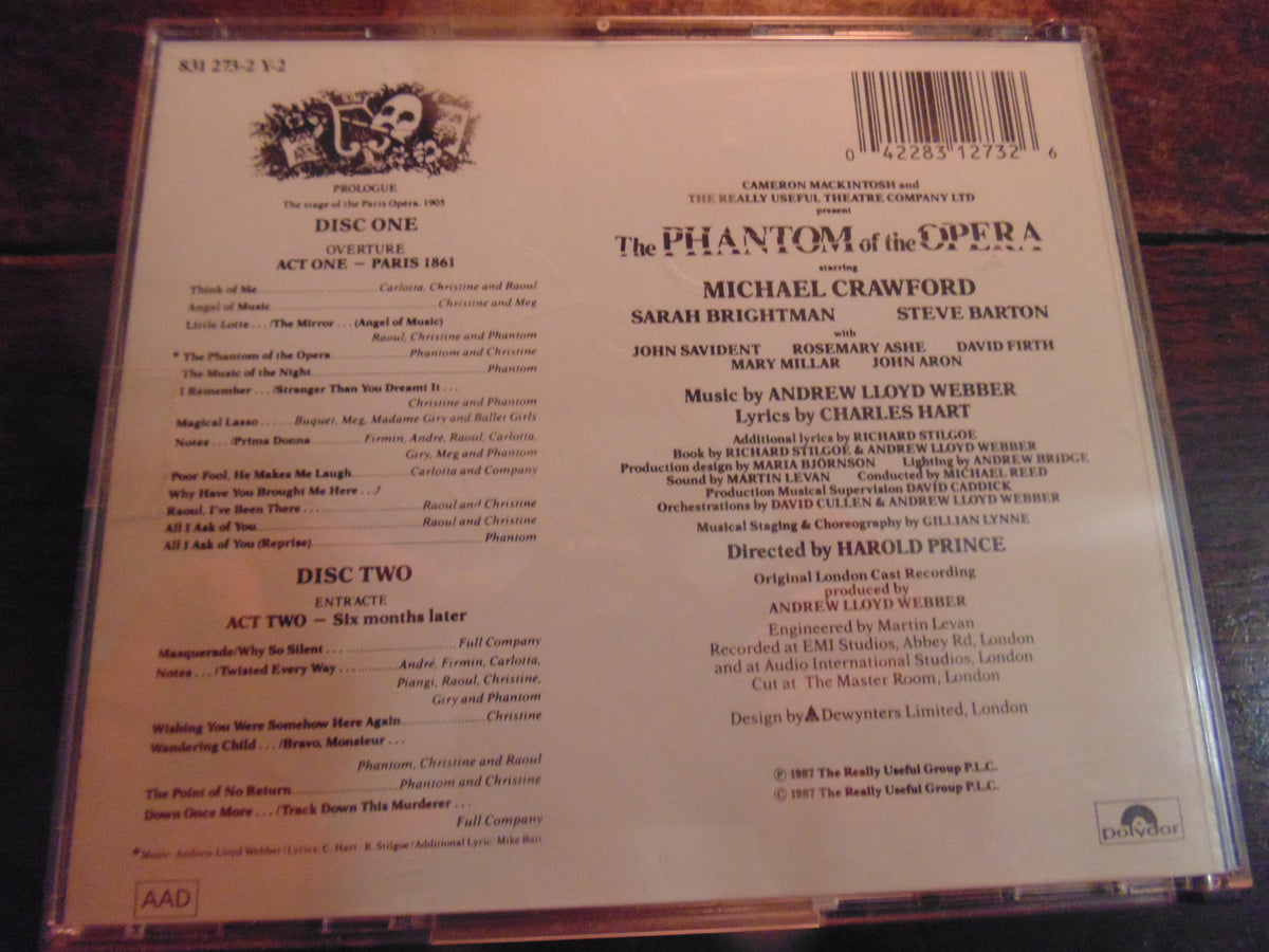 Music composed by Andrew Lloyd Webber. Lyrics by Charles Hart.Principal cast: Michael Crawford (The Phantom Of The Opera); Sarah Brightman (Christine Daae); Steve Barton (Raoul); John Savident (Monsieur Firmin); David Firth (Monsieur Andre); Rosemary Ashe (Carlotta Giudicelli); Mary Millar (Madame Giry); John Aron (Ubaldo Piangi); Paul Arden Griffith (Monsieur Reyer); Barry Clark (auctioneer); David De Van (Porter/Marksman/Fop); Janet Devenish (Meg Giry); David Jackson (Monsieur Lefervre); Janos Kurucz (Joseph Buquet); James Patterson (Don Attilio/Passarino); Peter Bishop (Slave Master); Justin Church (Flunky/Stagehand); Mostyn Evans (Policeman); Sue Flannery, Janet Howd (Page); Andrew Golder (Porter/Fireman); Peggy Ann Jones (Wardrobe Mistress/Confidante); Maria Kesselman (Princess); Patricia Richards (Madame Firmin); Jill Washington (Inkeeper's Wife).Recorded at EMI Studios & Audio International, London, England. Includes liner notes by Andrew Lloyd Webber.All tracks have been digitally remastered.Composer: Andrew Lloyd Webber .Composers: Andrew Lloyd Webber ; Richard Stilgoe.Lyricist: Charles Hart.Personnel: Naomi Tate, John Aron, John Savident, Lynn Jezzard, David de Van, David Firth, Janet Devenish, Patricia Merrin, Sally Ashfield, Alison Townsend, Barry G. Clark, Nicola Keen, Janos Kurucz, Michael Crawford , Rosemary Ashe, Sarah Brightman, Steve Barton (vocals); David Rose (guitar, bass guitar); Sheila Bromberg (harp); Mark Berrow, David Randall, John Willison, Alison Kelly , Ken Hogg, Geoffrey Grey, Laurie K. Lewis, Hans Geiger, Frances Walker, Mark Thomas , Gordon Buchan, Colin Staveley, Celia Sheen, Homi Kanga, Laurie Lewis, Billy Reid, Bill Reid (violin); Ernest Greaves, Robin Firman, Norman Jones (viola, cello); Norris Bosworth, Brian Mack, George Robertson, David Bellman, Mike Cookson, Linda Court, Kenneth Essex, John Meck, Bill Jones , Roger Welch, Alan Smyth, Jeremy White (viola); Bob Norris, Chris Green , Justin Pearson (cello); Alexa Turpin (flute, piccolo); Chris Gradwell (flute, clarinet, saxophone); Steve Pierce (clarinet); Keith Marshall (oboe); Pete Whittaker (bassoon); Norman Archibald, Graham Ashton, Howard (Jimmy) Evans (trumpet); Dick Wall (trombone); Derek Taylor, Nicholas Busch, Danielle Emond, Nick Busch, Keith Riby, Michael Dore (horns); Callum McLeod, Mike Stanley, Paul Maguire, Rod Argent (keyboards); Stan Barratt, Stan Barrett, Dave Locke (percussion).Liner Note Author: Andrew Lloyd Webber .Recording information: Audio International Studios, London, England; EMI Abbey Road Studios, London, England.Director: Harold Prince.Illustrators: Dean Hoad; Marcus Bradbury.Unknown Contributor Role: Sheila Bromberg.