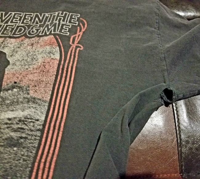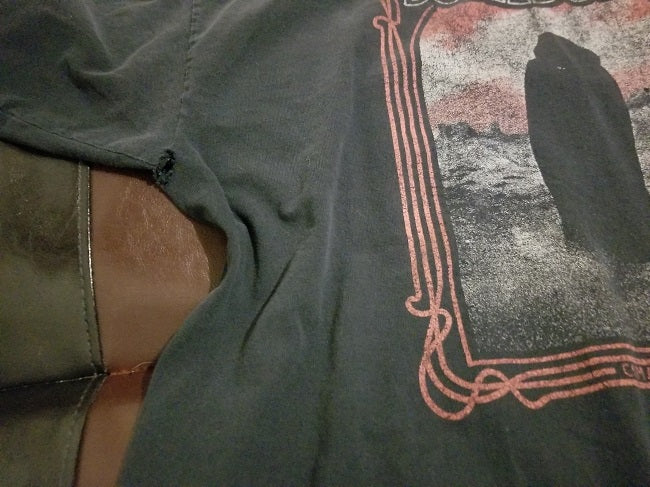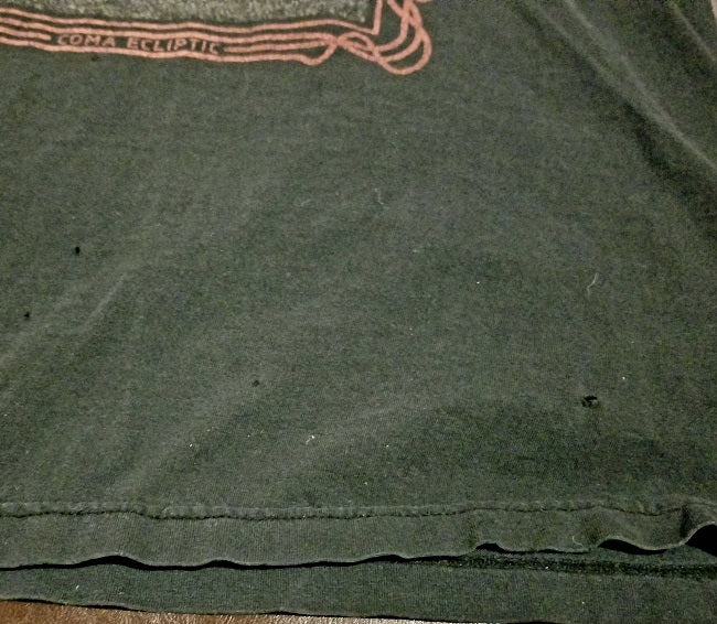 Description: Pre-owned. Heavy fading. There are small holes toward bottom front and there are holes under the armpits. Original OG t-shirt. No image on the back.